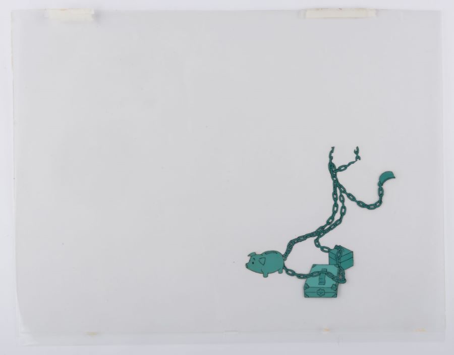 A multi-layer production cel from the Disney Studio animated film “Mickey’s Christmas Carol” (1983). Featuring Goofy as the Ghost of Jacob Marley, the hand-painted cel was created at the studio and used during the animation process. The cel is an actual frame of animation that was photographed and appears in the film. Measuring 12.5”x16” overall, with a character image size of 7.5”x6.25”, the cel is in good condition, laminated by the studio, with scratches, paint lifting and a crack to the Goofy layer, an air bubble between the celluloid and laminate, paint lifting throughout the chain layer with tape along the top edge, and bubbles to the reverse. The cel is presented with a reproduction color copy background for display purposes.